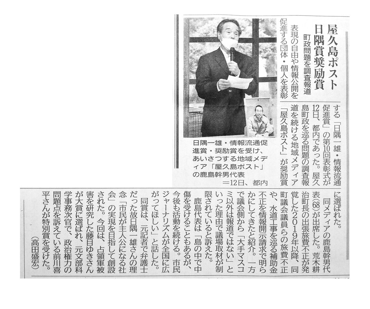 2022.06.15 お知らせ 南日本新聞が報道、屋久島ポストの日隅一雄・情報流通促進賞 受賞 yakushima-post 鹿島共同代表「市民ジャーナリズムを全国に広げたい」屋久島ポストの「日隅一雄・情報流通促進賞2022」奨励賞の受賞について報じる南日本新聞記事(2022年6月14日付) 「市民が主人公になる社会」の実現に向けて、表現の自由や国民主権の促進などに貢献した個人や団体を顕彰する「日隅一雄・情報流通促進賞2022」の奨励賞を屋久島ポストが受賞したことについて、南日本新聞が6月14日付の社会面で報じました。