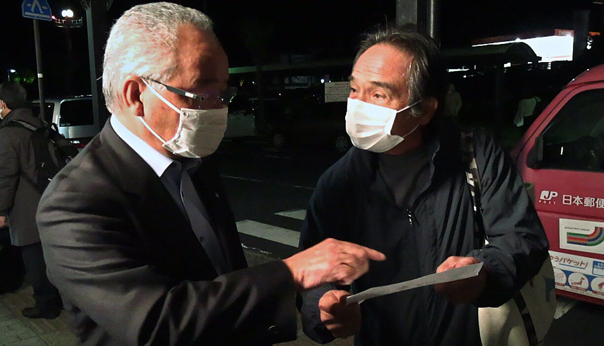 補助金申請で虚偽の報告書を出した問題について、荒木耕治町長(左)に取材する「屋久島ポスト」の鹿島幹男・共同代表(2021年12月1日、屋久島空港)