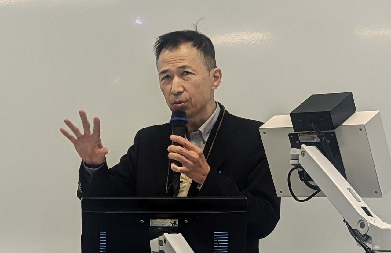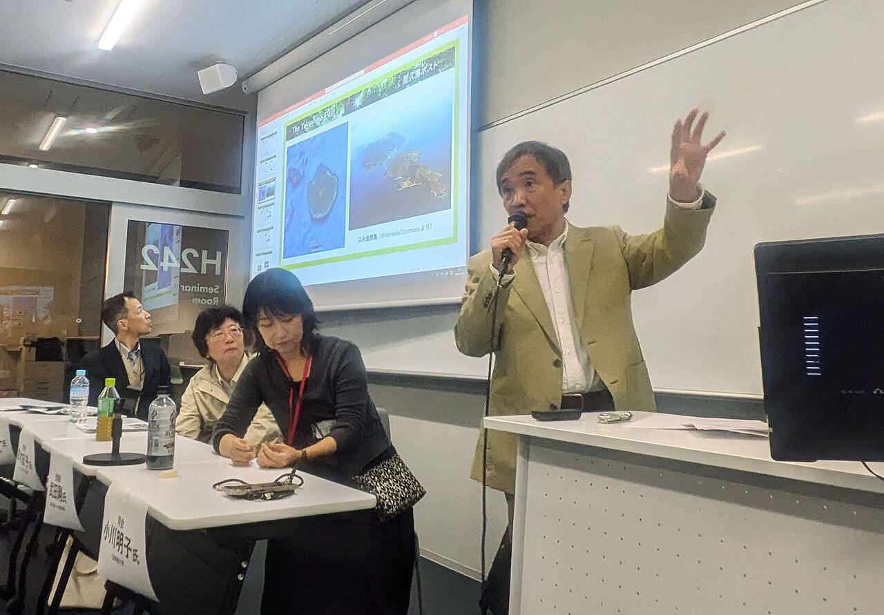 市民メディア全国交流集会で屋久島町政の問題について報告する「屋久島ポスト」の武田剛共同代表=右=(2024年11月23日、大阪府茨木市の立命館大学いばらきキャンパス、参加者撮影)