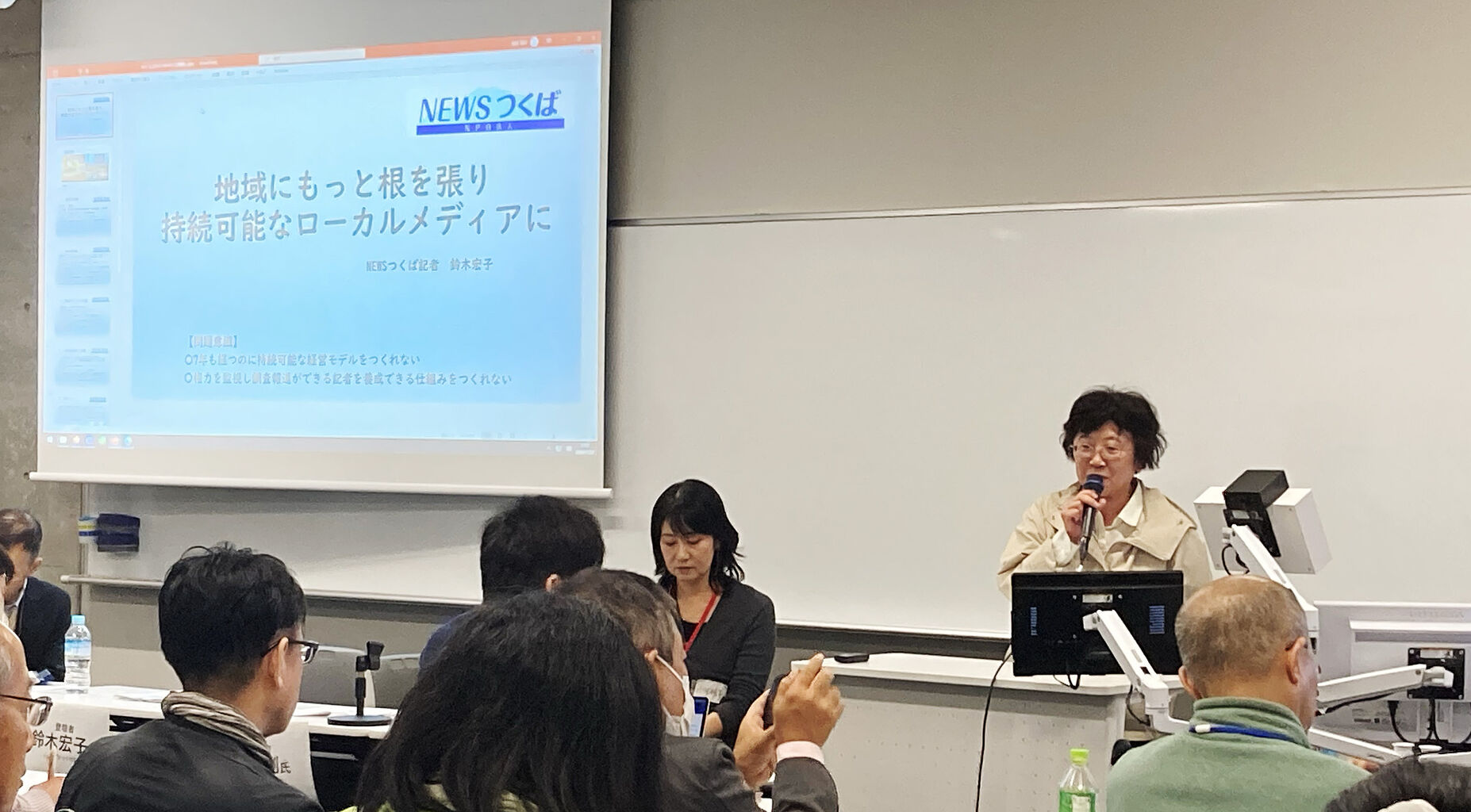 次にNEWSつくばの鈴木宏子記者は、茨城県の南部地域で発行されていた「常陽新聞」が休刊したことを受けて、2017年にNPO法人「NEWSつくば」としてネットメディアに転換した経緯などを説明。記者16人で取材を続け、つくば市のシンボル的な存在である「つくばセンタービル」の大幅改修を阻止したり、市民と一緒に霞ケ浦に注ぐ桜川の環境を守るプロジェクトを企画したりした実績を紹介した。