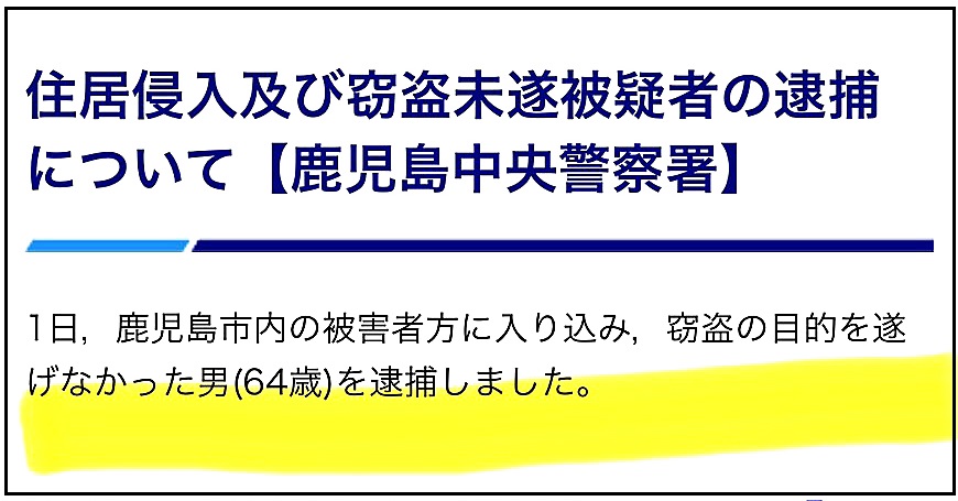 「住居侵入及び窃盗未遂被疑者の逮捕について【鹿児島中央警察署】1日、鹿児島市内の被害者方に入り込み、窃盗の目的を遂げなかった男(64)を逮捕しました。」