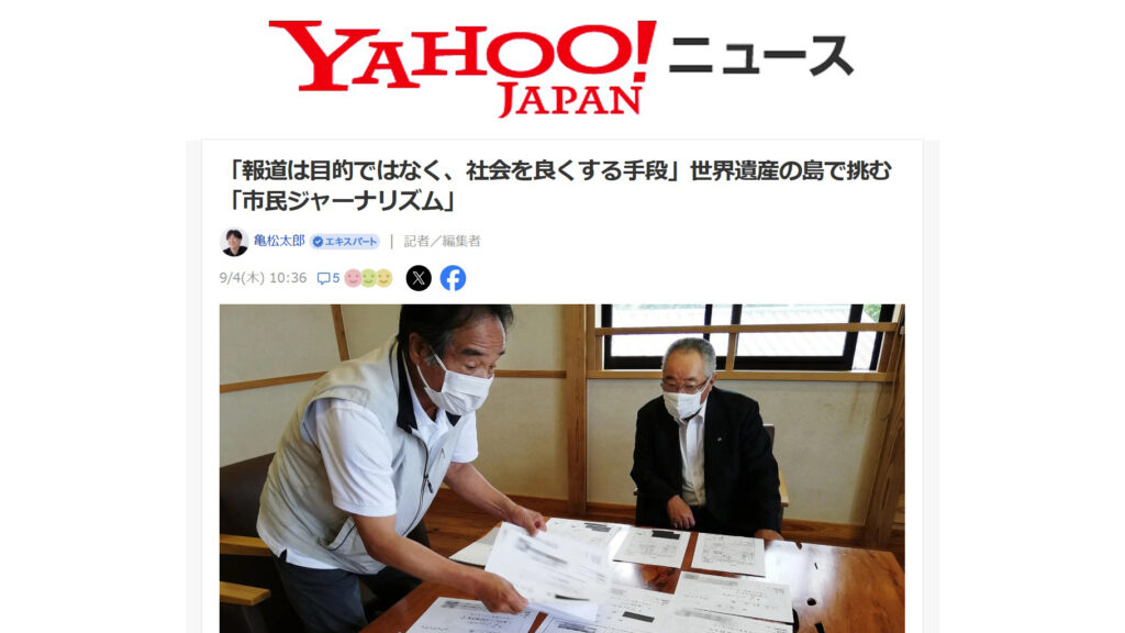ヤフーニュースは9月4日、調査報道大賞の奨励賞を受賞した市民メディア「屋久島ポスト」を紹介する記事を配信した。ヤフーニュースのエキスパートで、「あしたメディア研究会」代表の亀松太郎さんが屋久島ポストの武田剛共同代表を取材し、4年にわたる調査報道の成果や意義などについて伝えている。