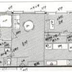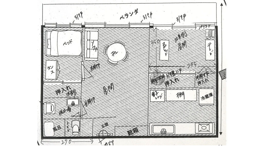 警察の実況見分で使われた被害者宅の間取り図。管理人は写真中央右に記載された「押入れ」で女性用の下着を物色した(被害者に開示された事件記録より ※一部でモザイク加工をしています)