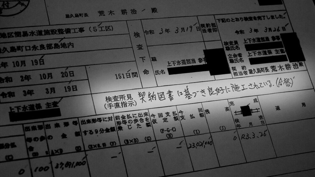 国庫補助金 不正請求事件 yakushima-post 屋久島町が国に提出した水道工事の検査調書。工事が未完成だったにもかかわらず、「契約図書に基づき良好に施工されている.(合格)」と記載されている 屋久島町が国に水道工事の補助金を申請する際に、実際には工事が未完成だったにもかかわらず、「すべての工事が終わった」と虚偽の報告をしていたことがわかった。その結果、国は町に補助金1700万円の返還を命令。さらに、町長ら町幹部の責任を追及する住民訴訟が提起された。 国庫補助金 不正請求事件 記事一覧